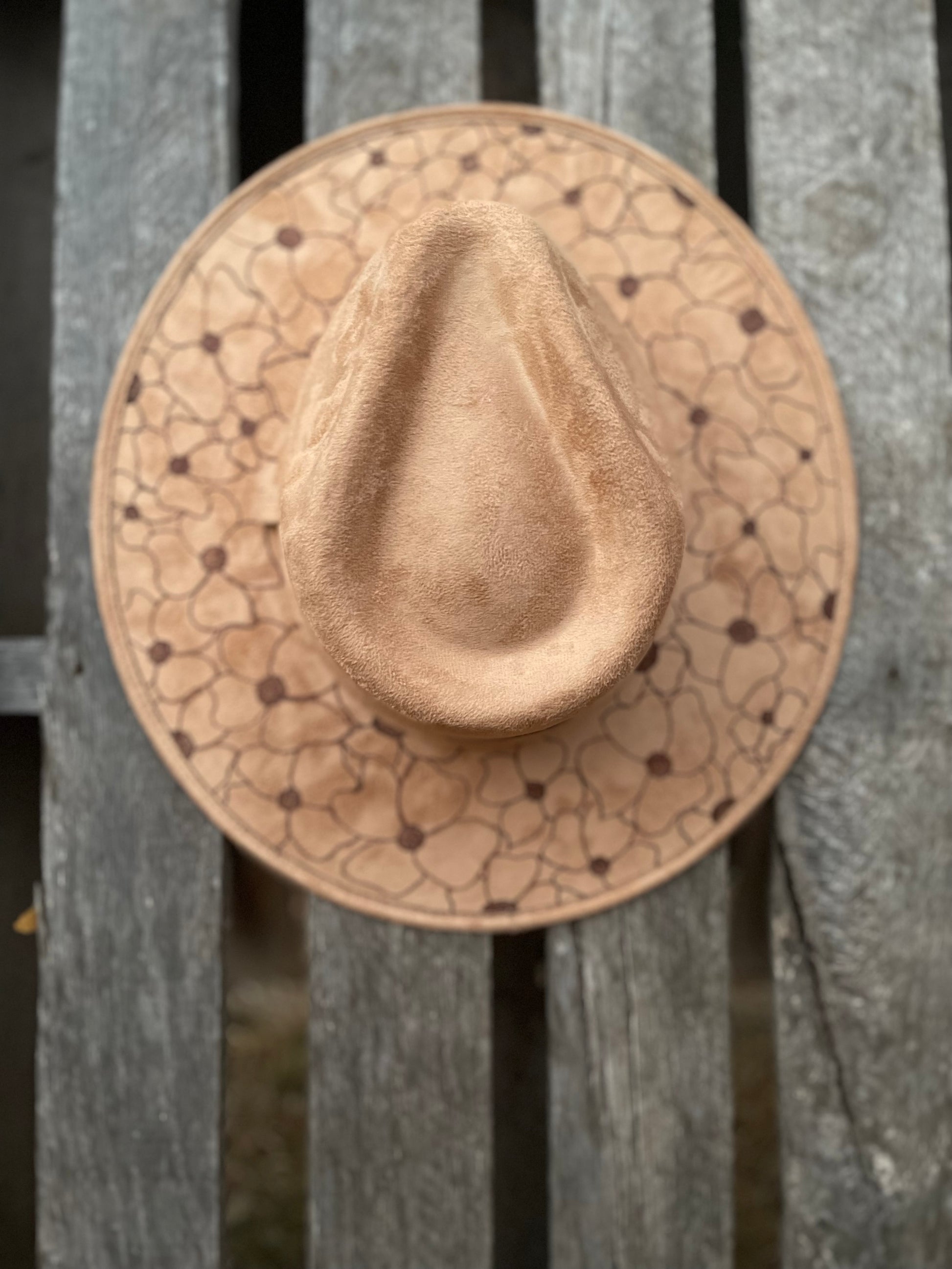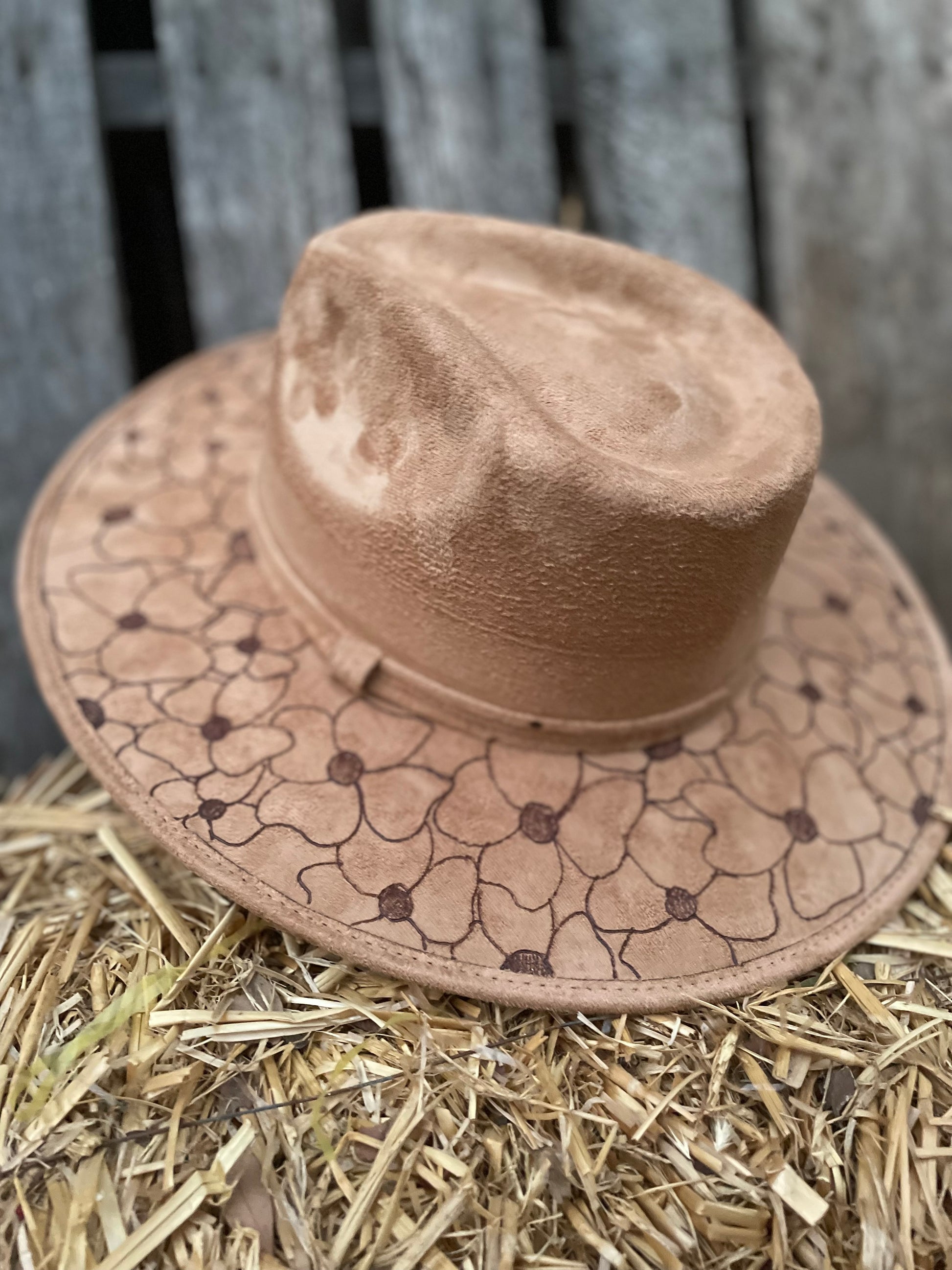 Western flat brim suede hat with burned in art work